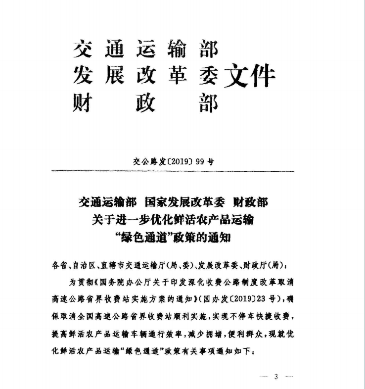 交通运输部、国家发展改革委、财政部《关于进一步优化鲜活农产品运输“绿色通道”政策的通知》(交公路发〔2019〕99号)