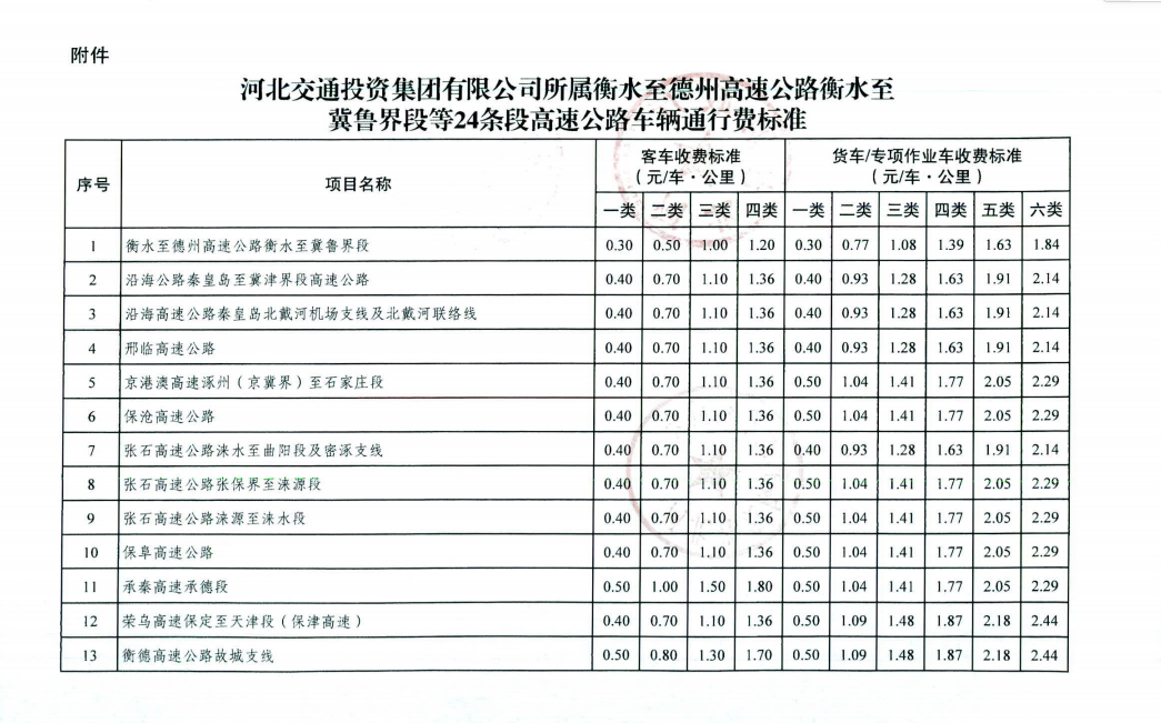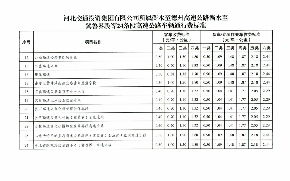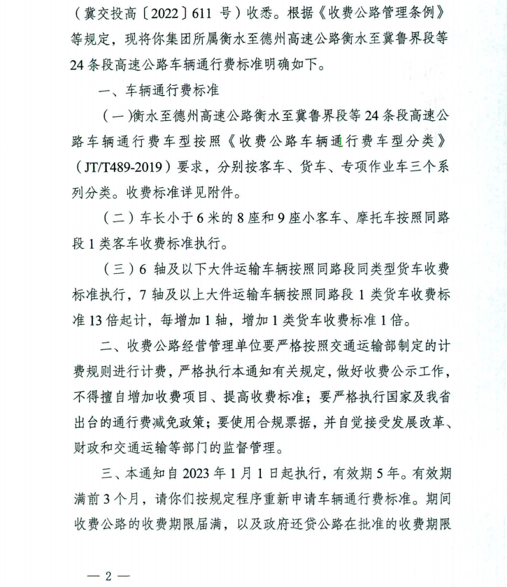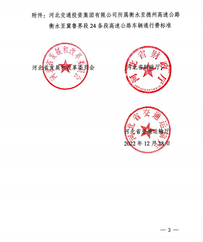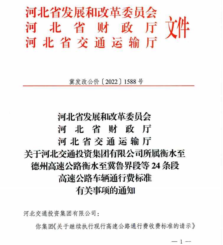 省发展改革委、省财政厅、省交通运输厅《关于河北交通投资集团有限公司所属衡水至德州高速公路衡水至冀鲁界段等 24条段高速公路车辆通行费标准有关事项的通知》(冀发改公价〔2022〕1588号)